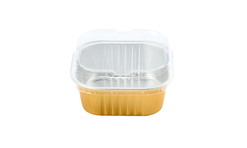 EXLUSIVO MIN-MOLDE CUADRADO de papel aluminio REF.SW523 de 88MM X 88 MM X 27 MM de altura. Capacidad: 100ml. con tapas plástica tránsparente.
